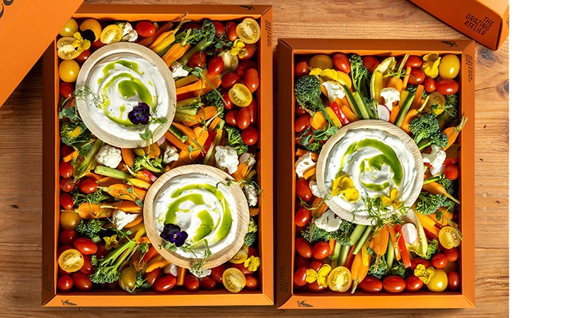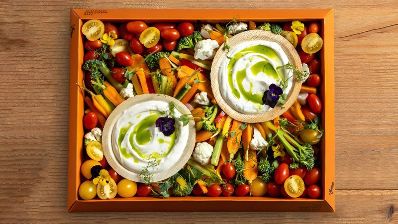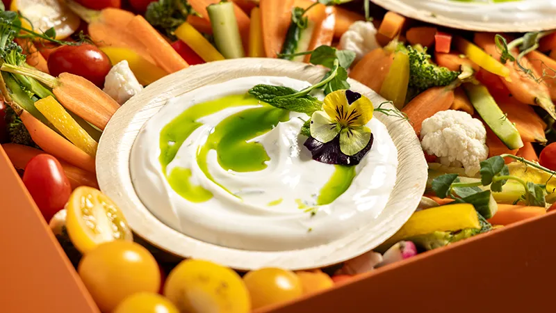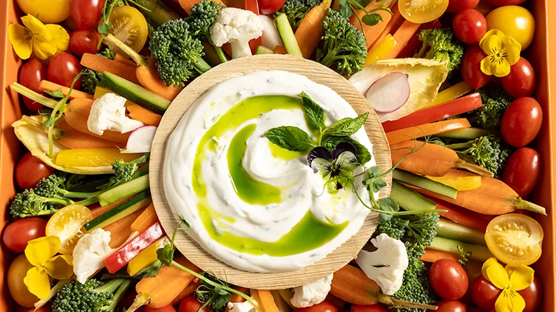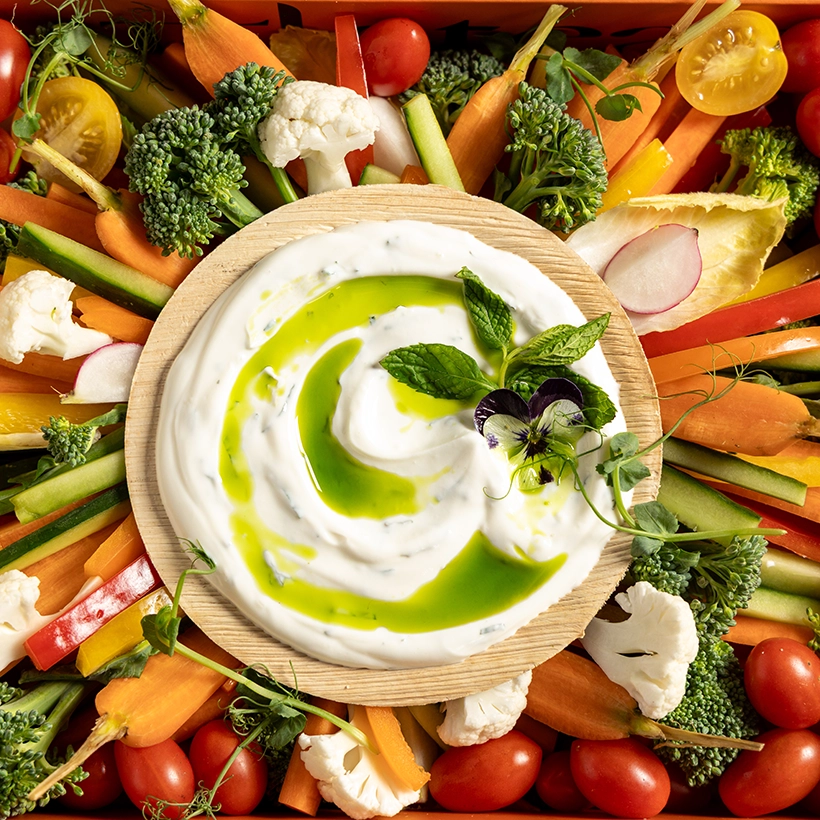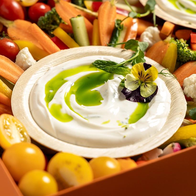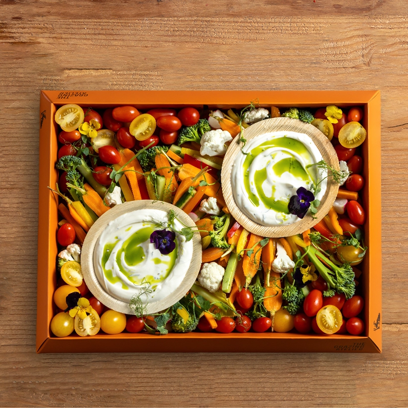 Μια έκρηξη από χρώμα με ‘τραγανό χαρακτήρα’ και απόλυτη φρεσκάδα. Πολύχρωμα τοματίνια, baby καρότα, φρεσκοκομμένα sticks λαχανικών και ένα δροσερό dip γιαουρτιού με μυρωδικά που δένει τα πάντα μαγικά.